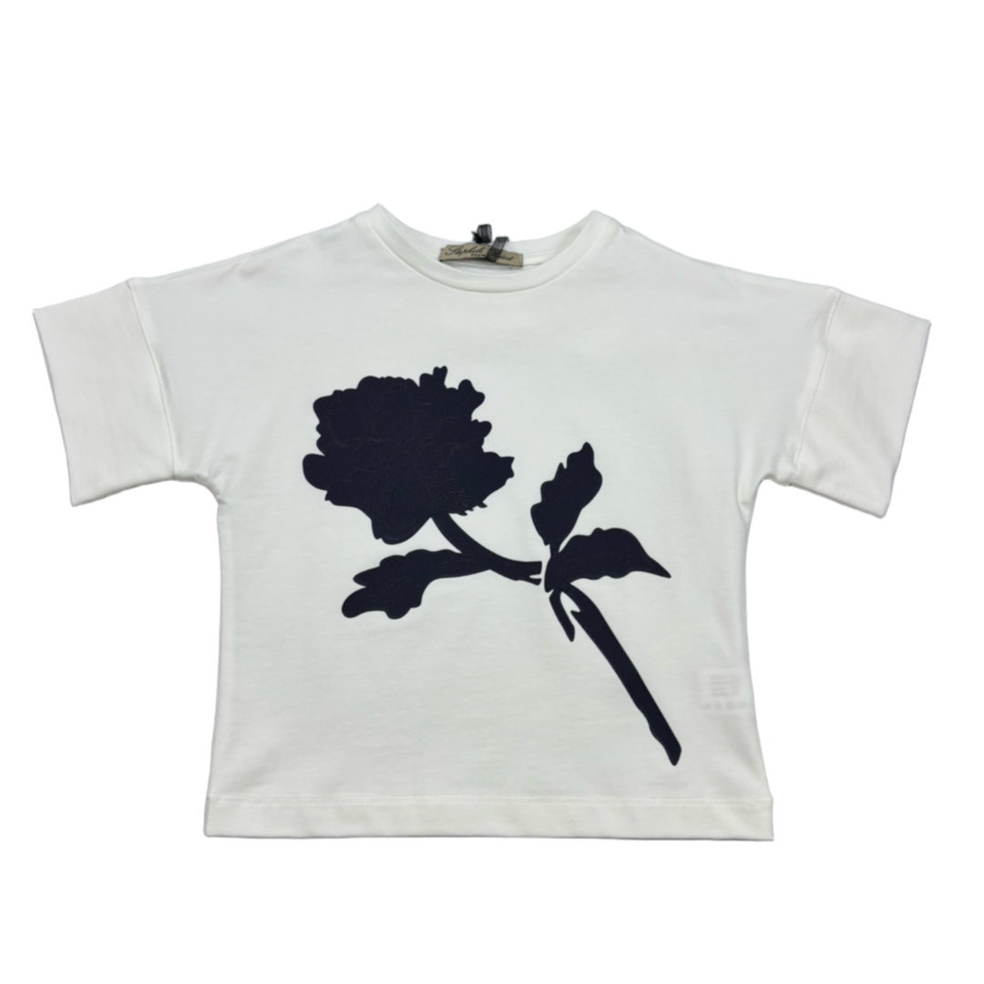 Эта футболка станет отличным дополнением базового гардероба. Мягкая и удобная, она выполнена из качественного материала, который обеспечивает комфорт при носке. Декоративные элементы в виде цветка добавляют оригинальности и стиля. Идеально подходит как для повседневного образа, так и в качестве основы стильного лука. Цвет молочной с синими нотками позволяет сочетать её с различными элементами одежды, подчеркивая индивидуальность владельца.